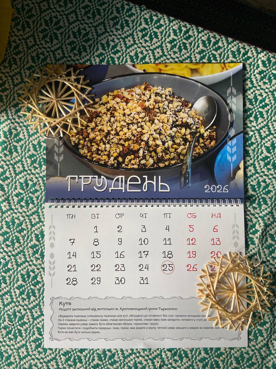 Найбільша цінність цього календаря — рецепти від місцевих жителів Кіровоградщини. Вони були записані під час етнографічних експедицій «Баба Єлька» — зі слів жінок, які пам’ятають ці страви з дитинства і готують їх досі.