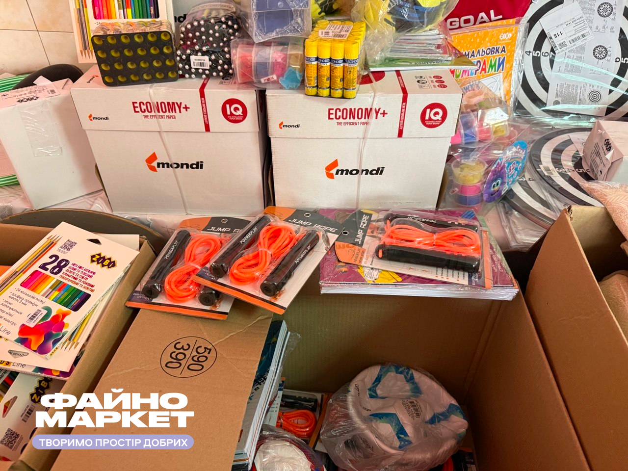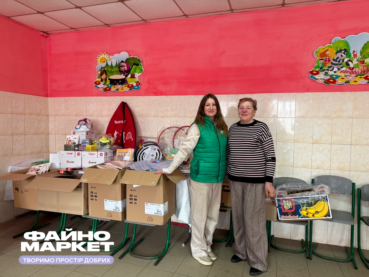 Для творчих занять та навчання зібрали цілі набори з кольорового паперу й картону, альбомів, олівців, розмальовок, кінетичного піску, пластиліну та іншої необхідної канцелярії. А щоб підкріпити імунітет та додати енергії, доповнили все це свіжими бананами та яблуками.